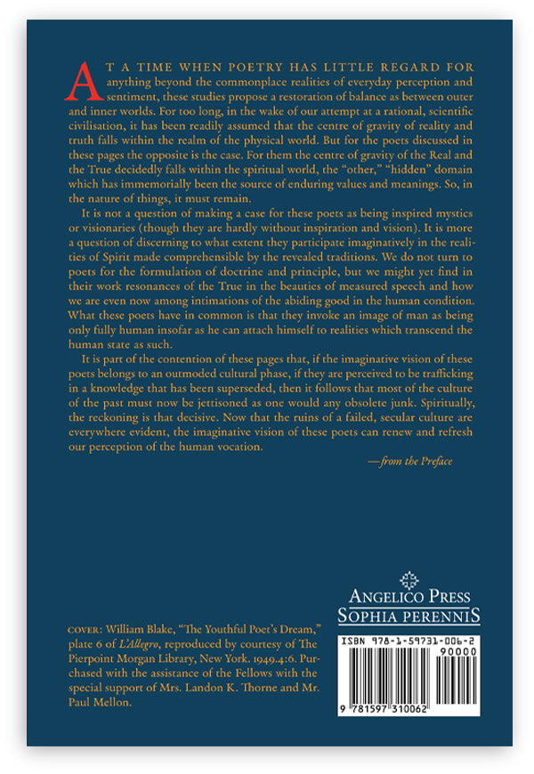It is not a question of making a case for these poets as being inspired mystics or visionaries (though they are hardly without inspiration and vision). It is more a question of discerning to what extent they participate imaginatively in the realities of Spirit made comprehensible by the revealed traditions. We do not turn to poets for the formulation of doctrine and principle, but we might yet find in their work resonances of the True in the beauties of measured speech and how we are even now among intimations of the abiding good in the human condition. What these poets have in common is that they invoke an image of man as being only fully human insofar as he can attach himself to realities which transcend the human state as such.