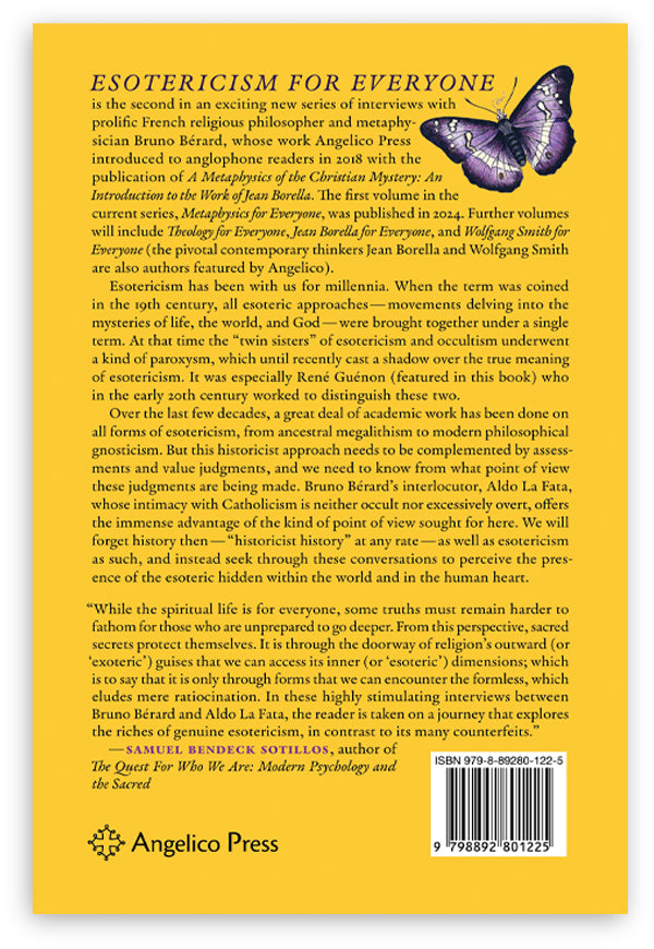 Esotericism for Everyone is the second in an exciting new series of interviews with prolific French religious philosopher and metaphysician Bruno Bérard, whose work Angelico Press introduced to anglophone readers in 2018 with the publication of A Metaphysics of the Christian Mystery: An Introduction to the Work of Jean Borella. The first volume in the current series, Metaphysics for Everyone, was published in 2024. Further volumes will include Theology for Everyone, Jean Borella for Everyone, and Wolfgang Smith for Everyone (the pivotal contemporary thinkers Jean Borella and Wolfgang Smith are also authors featured by Angelico).