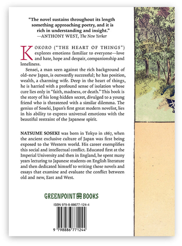 Sensei, a man seen against the rich background of old–new Japan, is outwardly successful; he has position, wealth, a charming wife. Deep in the heart of things, he is harried with a profound sense of isolation whose cure lies only in “faith, madness, or death.” This book is the story of his long-hidden secret, divulged to a young friend who is threatened with a similar dilemma. The genius of Soseki, Japan’s first great modern novelist, lies in his ability to express universal emotions with the beautiful restraint of the Japanese spirit.