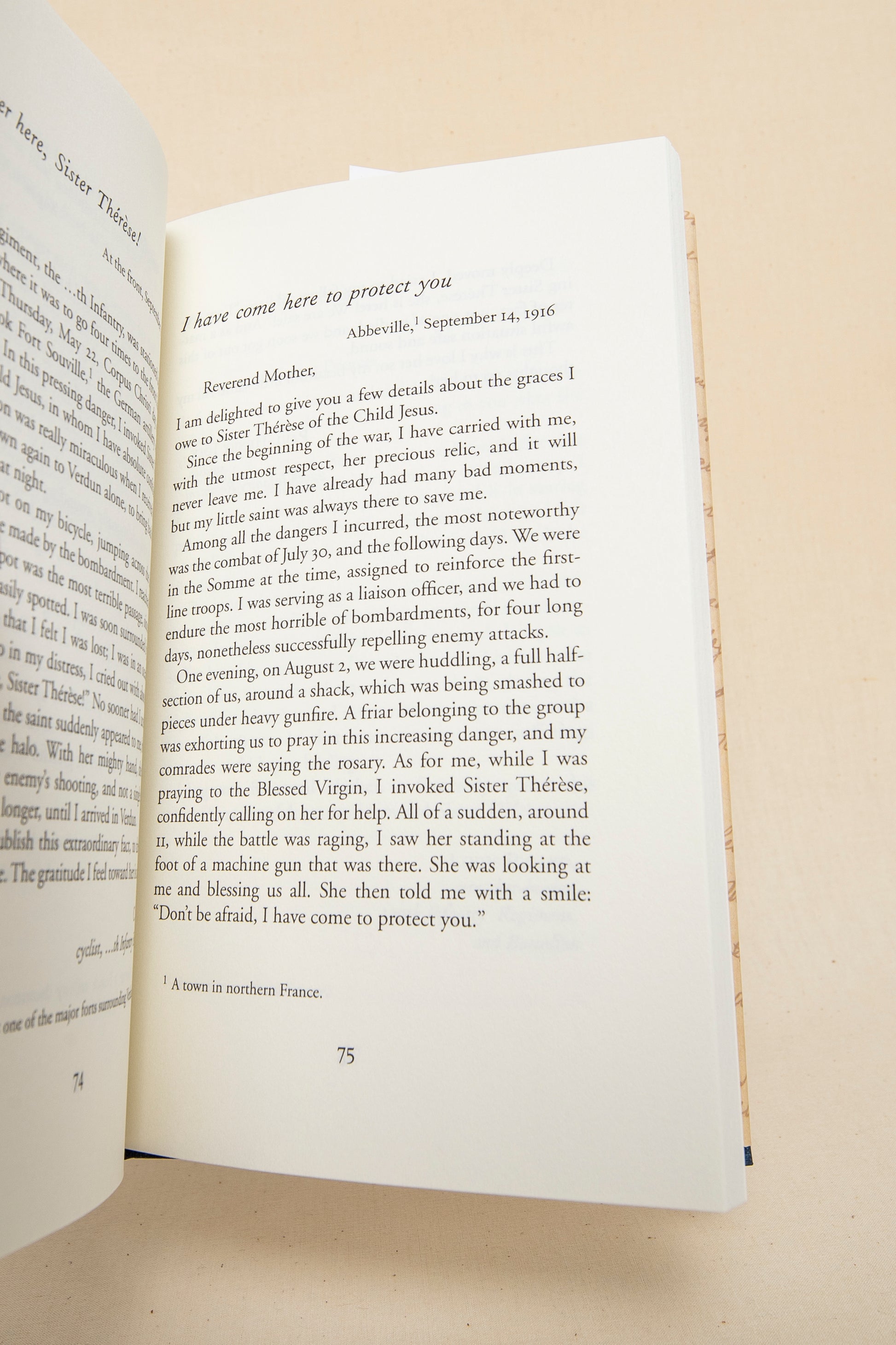 “In my distress, I cried out with absolute faith: ‘Over here, Sister Thérèse!’ No sooner had I uttered these words than the saint suddenly appeared to me, bright and with a large halo. With her mighty hand, she abruptly stopped the enemy’s shooting, and not a single shell was released any more, until I arrived in Verdun.” (May 1916) “I saw a sort of brightness, and the little Sister Thérèse who was looking at me with a smile. Oh, what kind eyes this saint had for me!” (June 1917) “I began to pray to the little Sister to have mercy on me, for I was without courage at the moment, and she appeared to me as she is on her image, but without telling me anything; I only felt she was protecting me, it was as if I read in her eyes: ‘I am here, do not fear anything.’” (October 1918)