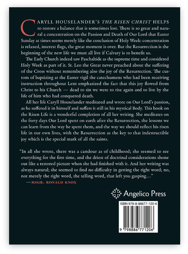 All her life Caryll Houselander meditated and wrote on Our Lord’s passion, as he suffered it in himself and suffers it still in his mystical Body. This book on the Risen Life is a wonderful completion of all her writing. She meditates on the forty days Our Lord spent on earth after the Resurrection, the lessons we can learn from the way he spent them, and the way we should reflect his risen life in our own lives, with the Resurrection as the key to that indestructible joy which is the special mark of all the saints.